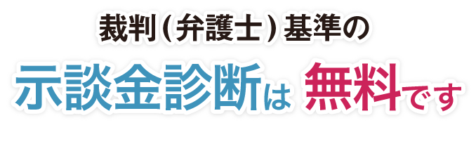 いまだに多くの人が保険会社からの提示や、若干の増額をした示談金で示談をしています。しかし、保険会社が示してくる示談金の額は、 慰謝料の基準や逸失利益の考え方として、いわゆる裁判(弁護士)基準よりも大幅に低額な場合がほとんどです。個別具体的な判断が必要となりますので、 無料診断をご利用ください。
